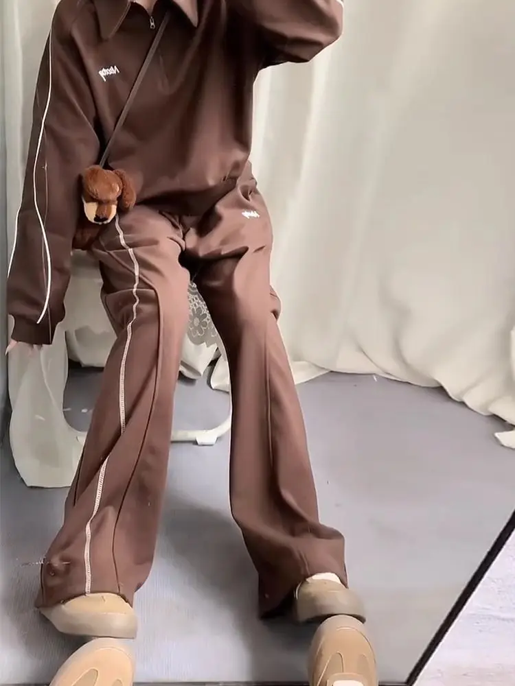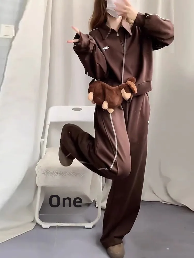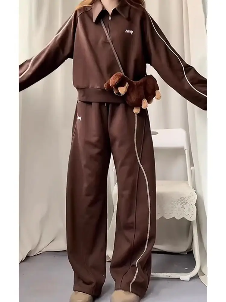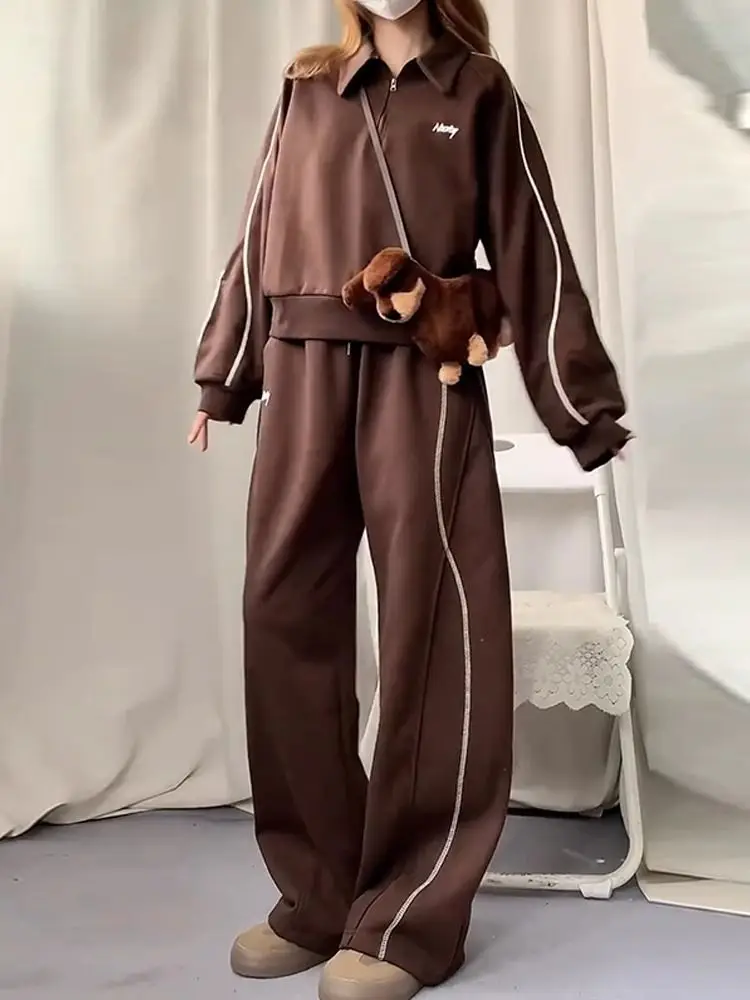 This two-piece set includes a polo-neck sweatshirt and long pants, providing versatility in styling.